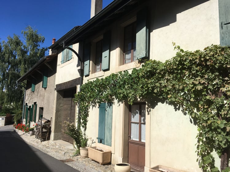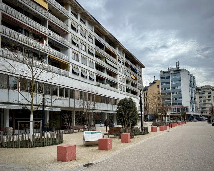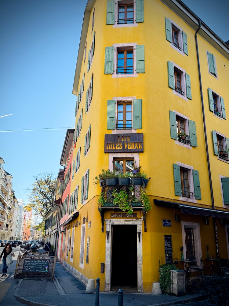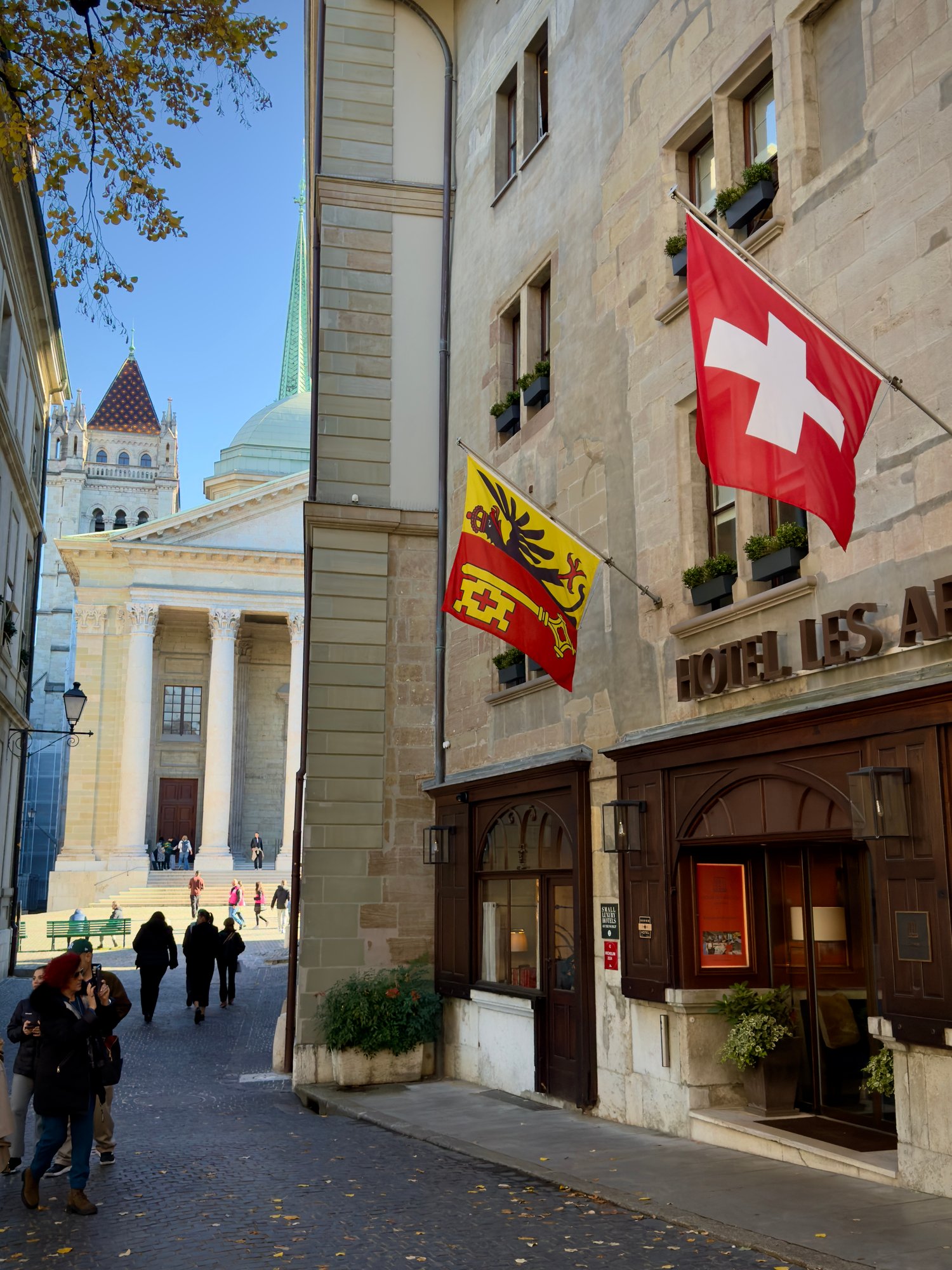 Image of Saint-Pierre Cathedral and a hotel facade in Geneva Old Town.